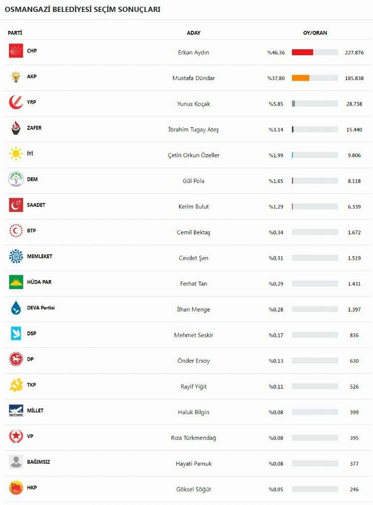 Resmi olmayan sonuçlara göre, CHP'nin adayı Erkan Aydın, Osmangazi'de belediye başkanlığı seçimlerini yüzde 46,36 ile kazandı.