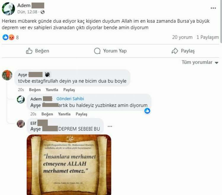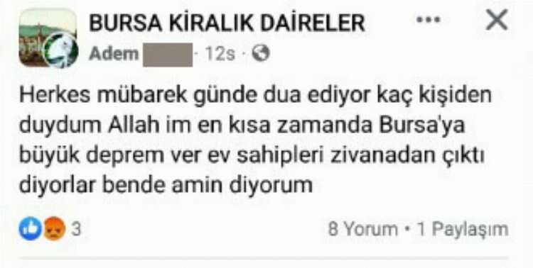 "Herkes mübarek günde dua ediyor kaç kişiden duydum" diyen Adem G. adlı şahıs "Allah'ım en kısa zamanda Bursa'ya büyük deprem ver. Ev sahipleri zıvanadan çıktı." diyorlar. Bende amin diyorum." ifadelerini kullandı.
