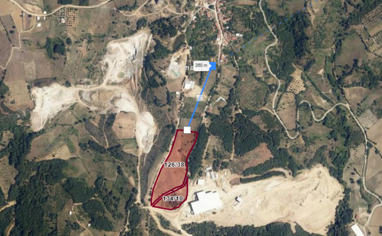 (Beyaz alanlar köyü saran mevcut ocakları, kırmızı alanlar ise maden firmasının talip olduğu öne sürülen alanları gösteriyor.)