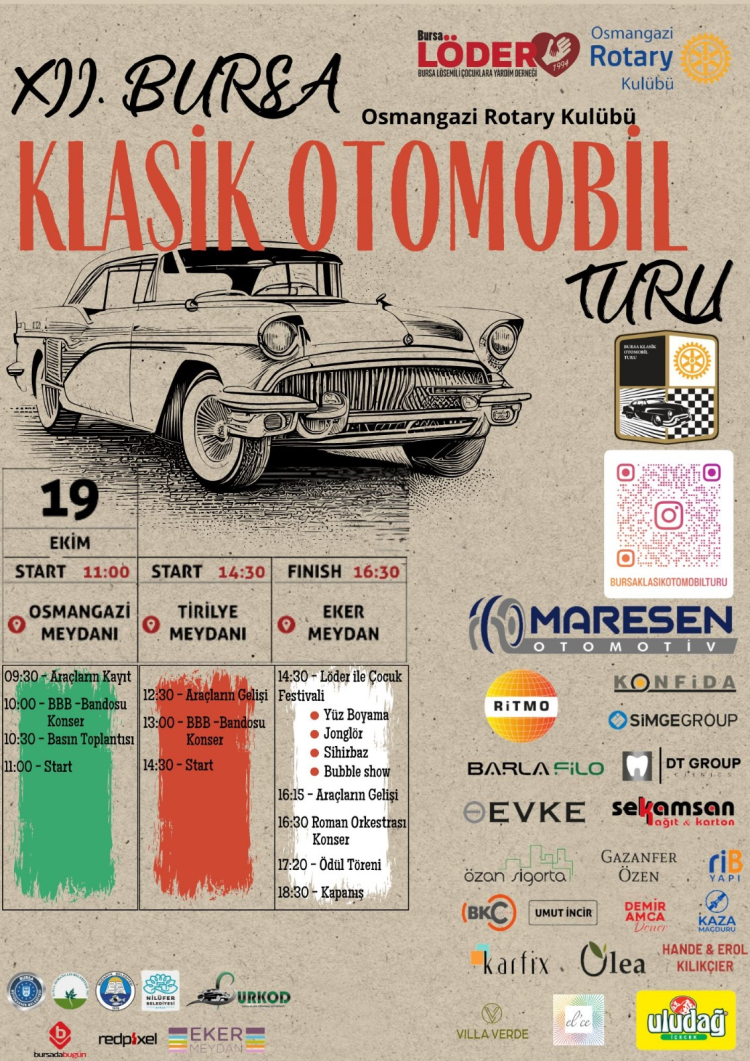 Osmangazi Rotary Kulübü liderliğinde 12.’si düzenlenecek olan Klasik Otomobil Turu, 19 Ekim 2024 Cumartesi günü Bursa’nın tarihi güzellikleri ve doğal manzaraları eşliğinde gerçekleşecek.