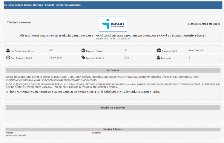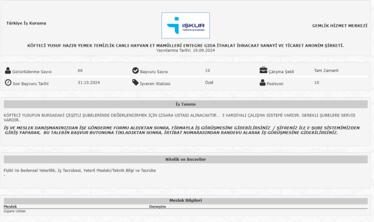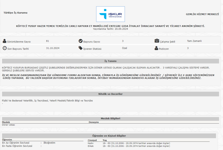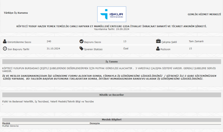 Çeşitli pozisyonlarda 59 personel aradığını duyururan Köfteci Yusuf, iş ilanları İŞKUR üzerinden paylaştı.