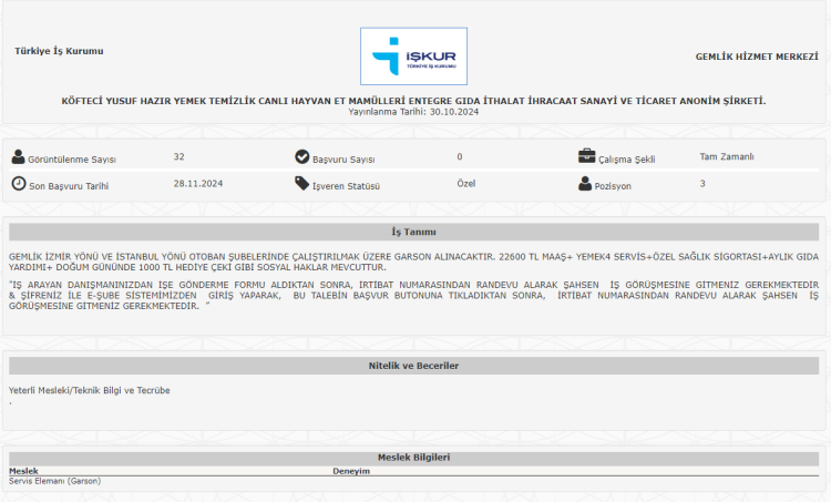 Garson alımı için yayımlanan iş ilanında; Gemlik İzmir yönü ve İstanbul yönü otoban şubelerinde çalışacağı açıklandı.