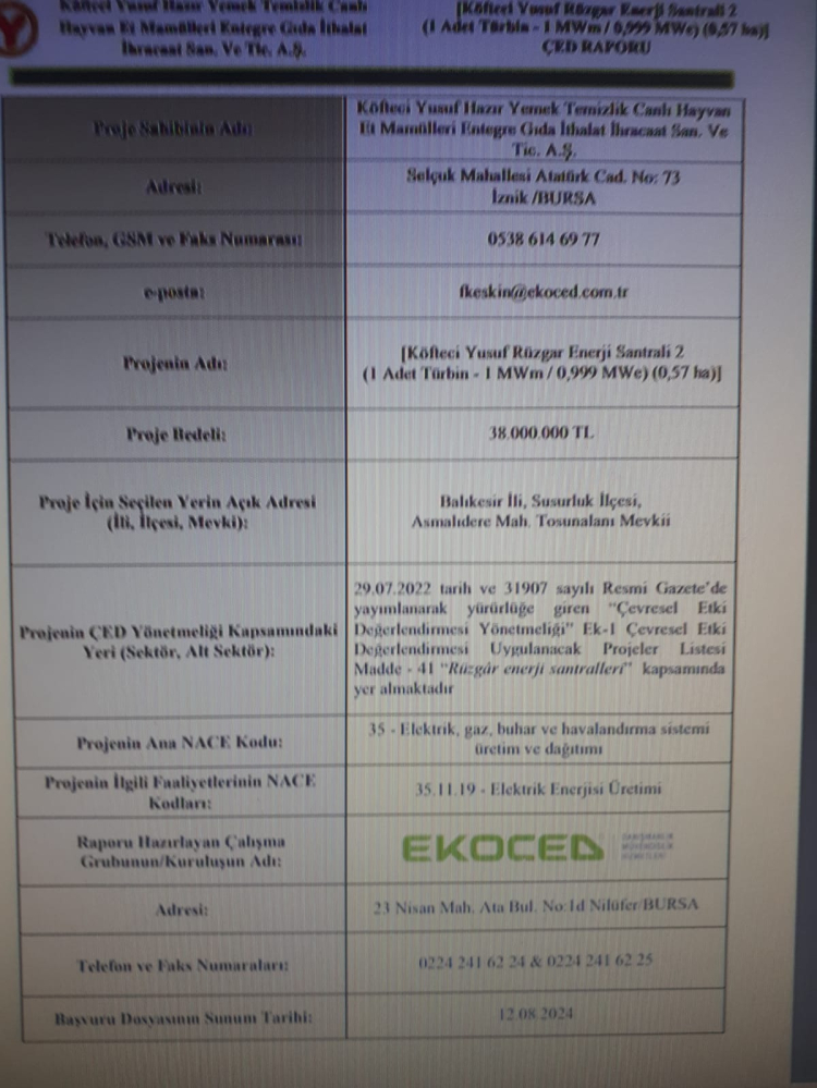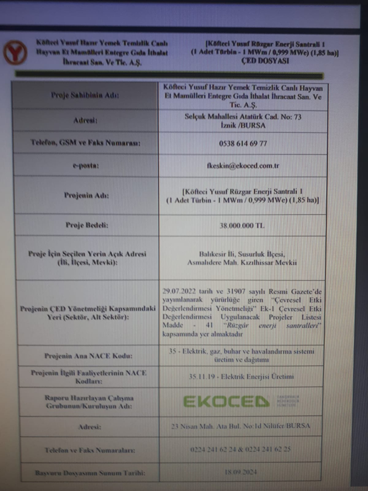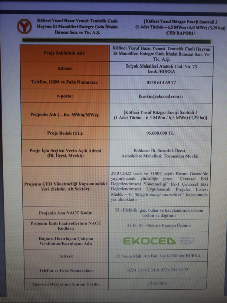 Balıkesir İli Susurluk ilçesi sınırları içerisinde Köfteci Yusuf Hazır Yemek Temizlik Canlı Hayvan Et Mamülleri Entegre Gıda İthalat İhracaat San. Ve Tic. A.Ş. tarafından yapılması planlanan [Köfteci Yusuf Rüzgar Enerji Santrali projesi ile ilgili olarak hazırlanan ÇED Raporu, ÇED Yönetmeliği'nin 11. maddesi kapsamında Bakanlığımıza sunulmuş olup, inceleme değerlendirme süreci başlamıştır. Proje ile ilgili olarak 22/10/2024 tarihinde İDK toplantısı gerçekleştirilecektir. Bakanlığımıza sunulan ÇED Raporu https://eced-duyuru.csb.gov.tr/eced-prod/duyurular.xhtml adresinde yer almaktadır. ÇED Raporu ilgililere ve kamuoyuna duyurulur.