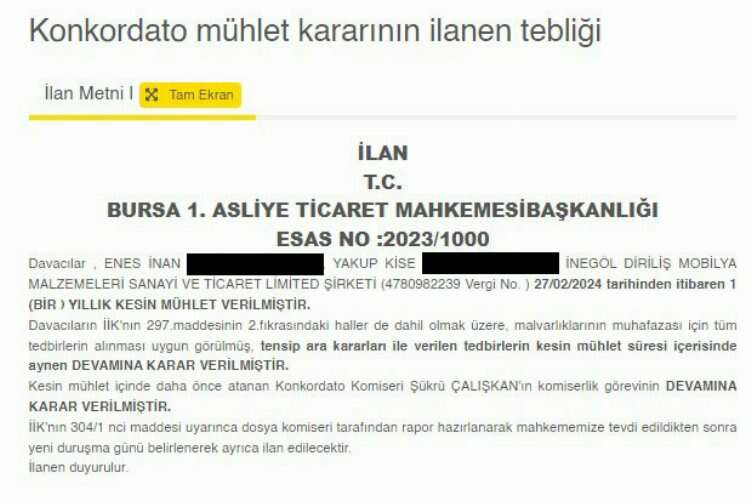 Davacılar, Enes İnan, Yakup Kise, İnegöl Diriliş Mobilya Malzemeleri Sanayi Ve Ticaret Limited Şirketi (4780982239 Vergi No. ) 27/02/2024 tarihinden itibaren1 (bir ) yıllık kesin mühlet verilmiştir.