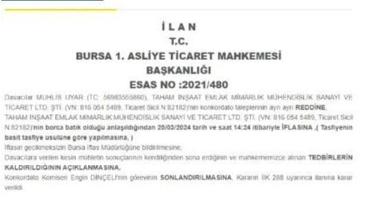 Karar Gazetesi'nin haberine göre; Bursa merkezli Taham İnşaat, borçlarını yapılandırmak amacıyla konkordato talep etmişti ancak mahkeme, şirketin konkordato süresinin uzatılma talebini reddetti. Böylece Taham İnşaat'ın iflasına karar verildi ve tüm faaliyetleri durduruldu. Şirketin Türkiye, Avrupa ve Afrika'daki projeleri ise yarım kaldı.