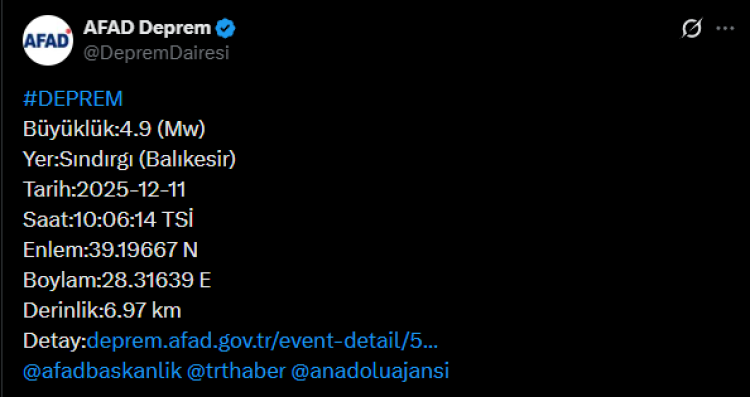 "Balıkesir ilimizin Sındırgı ilçesinde saat 10.06’da meydana gelen 4.9 büyüklüğündeki #deprem sonrası, an itibarıyla, olumsuz bir durum bulunmamaktadır.