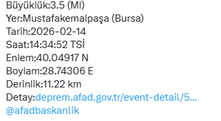 Afet ve Acil Durum Yönetimi Başkanlığı (AFAD) Deprem Dairesi, Bursa'nın Mustafakemalpaşa ilçesinde saat 14.34 sıralarında 3.5 büyüklüğünde bir deprem meydana geldiğini duyurdu.