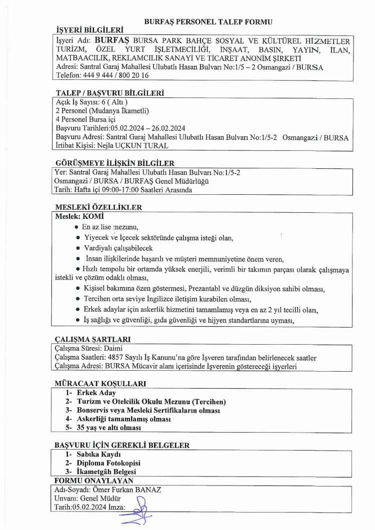 Söz konusu ilanlarda 12 barista, 6 komi, 5 garson, 6 şef garson, 2 döner ustası, 7 temizlik/bulaşık personeli alınacağo belirtildi.