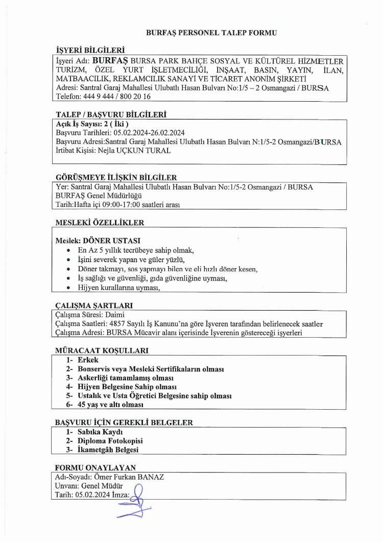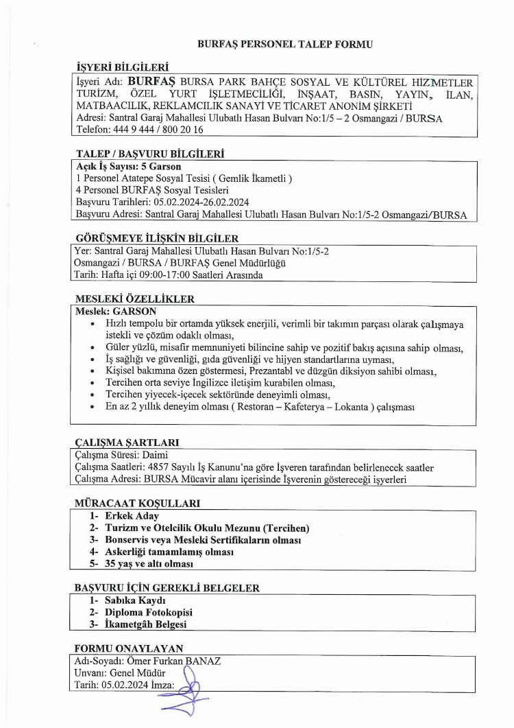 Sosyal tesisleriyle Bursalı vatandaşlara uygun fiyatlı olarak hizmet veren Bursa Büyükşehir Belediye İktisadi Teşekkülü BURFAŞ onlarca personel alımı yapacağını duyurdu.