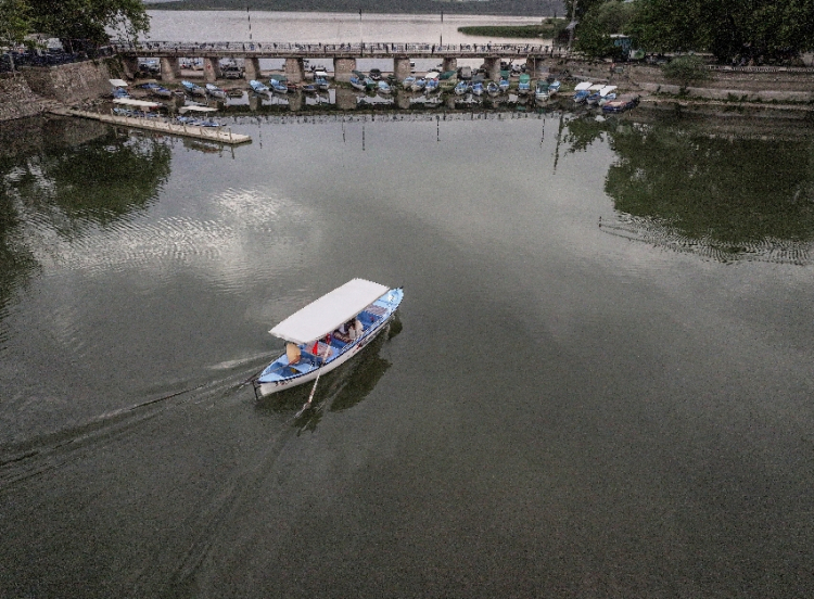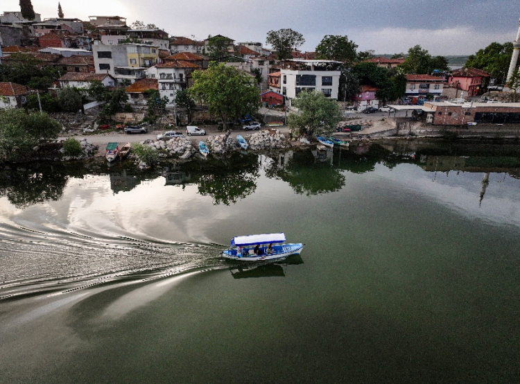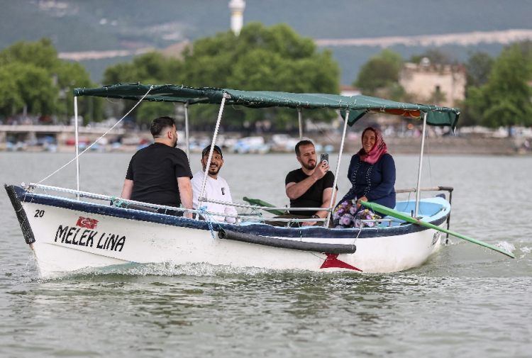 Bursa'da antik adı "Apollonia ad Rhyndacum" olan Gölyazı Mahallesi'ne kıyısı bulunan Uluabat Gölü'nde turistlere kayık turu yaptıran kadınlar, aile bütçesine katkıda bulunuyor.