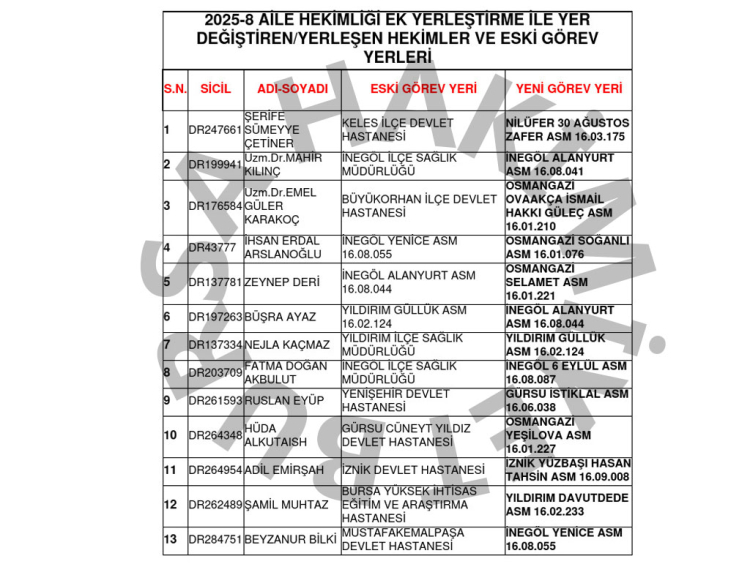 Bursa'nın Nilüfer, İnegöl, Osmangazi, Yıldırım, Gürsu ve İznik ilçelerinde görev yapan 13 yeni aile hekimi farklı birimlere atandı. İşte hekimlerin eski ve yeni görev yerleri...