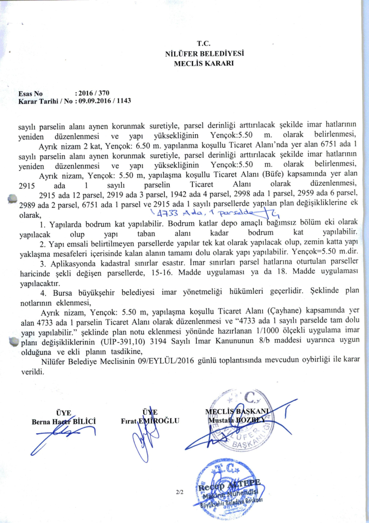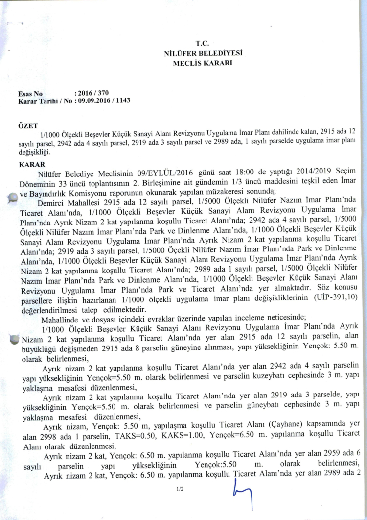 Mahkeme kararına konu olan imar düzenlemesi, Nilüfer Belediye Meclisi’nin 9 Eylül 2016 tarihli ve 1143 sayılı kararıyla uygun bulunmuş, ardından Bursa Büyükşehir Belediye Meclisi’nin 20 Ekim 2016 tarihli kararıyla onaylanmıştı. Bu kapsamda, Beşevler Küçük Sanayi Sitesi Uygulama İmar Planı’nda yer alan Demirci Mahallesi 2919 ada 3 parsel için plan değişikliği yapılmıştı.