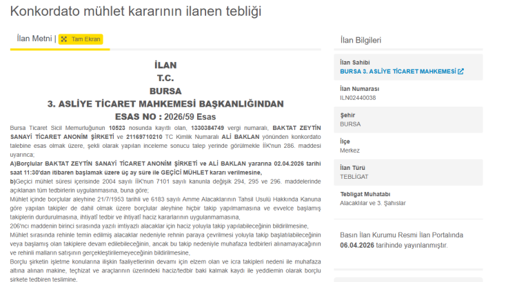 Mahkeme tarafından verilen karara göre, Baktat Zeytin ve Ali Baklan hakkında 02 Nisan 2026 tarihinden itibaren geçerli olmak üzere 3 ay süreyle geçici konkordato mühleti verildi.