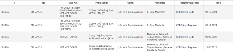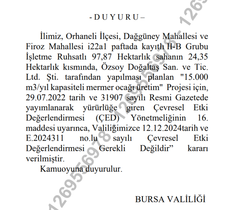 Yapılan açıklamada, "Bursa ili Orhaneli ilçesi Firoz Köyü mevkiindeki Özsoy Doğaltaş Sanayi ve Ticaret Limited Şirketi tarafından yapılması planlanan RN: 202001612 (ER: 3399085) numaralı mermer ocağı işletmesİ projesi ile ilgili olarak Bakanlığımıza sunulan PTD Dosyası incelenmiş ve değerlendirilmiştir ÇED Yönetmeliği'nin 17. maddesi gereğince RN: 202001612 (ER: 3399085) numaralı mermer ocağı işletmesi projesi'ne Valiliğimizce 'Çevresel Etki Değerlendirmesi Gerekli Değildir' kararı verilmiştir." ifadeleri kullanıldı.