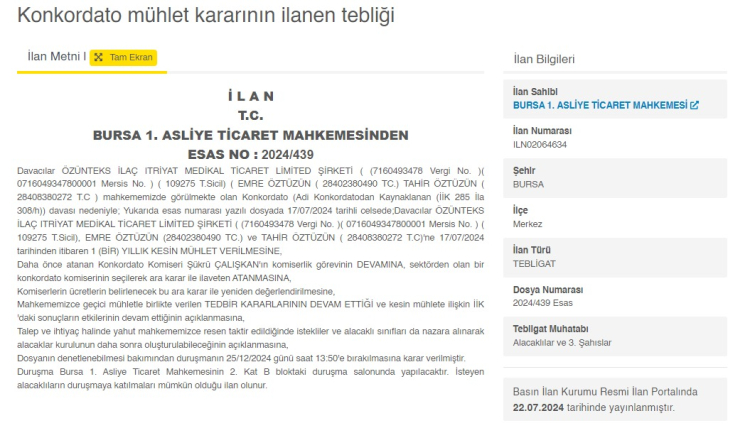 Mahkeme tarafından yapılan açıklamada, "Davacılar Özünteks İlaç Itriyat Medikal Ticaret Limited Şirketi'nin mahkememizde görülmekte olan Konkordato (Adi Konkordatodan Kaynaklanan (İİK 285 İla 308/h)) davası nedeniyle; 17/07/2024 tarihinden itibaren 1 (bir) yıllık kesin mühlet verilmesine, daha önce atanan Konkordato Komiseri Şükrü Çalışkan'ın komiserlik görevinin devamına, sektörden olan bir konkordato komiserinin seçilerek ara karar ile ilaveten atanmasına, komiserlerin ücretlerin belirlenecek bu ara karar ile yeniden değerlendirilmesine, mahkememizce geçici mühletle birlikte verilen tedbir kararlarının devam ettiği ve kesin mühlete ilişkin İİK 'daki sonuçların etkilerinin devam ettiğinin açıklanmasına, talep ve ihtiyaç halinde yahut mahkememizce resen taktir edildiğinde istekliler ve alacaklı sınıfları da nazara alınarak alacaklar kurulunun daha sonra oluşturulabileceğinin açıklanmasına, dosyanın denetlenebilmesi bakımından duruşmanın 25/12/2024 günü saat 13:50'e bırakılmasına karar verilmiştir. Duruşma Bursa 1. Asliye Ticaret Mahkemesinin 2. Kat B bloktaki duruşma salonunda yapılacaktır. İsteyen alacaklıların duruşmaya katılmaları mümkün olduğu ilan olunur." ifadelerine yer verildi.