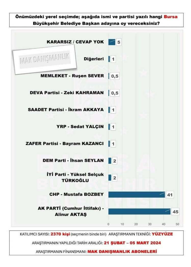 Yerel seçimler ile ilgili bir ankette MAK Danışmanlık’tan geldi. Bursa'da yapılan araştırmanın sonuçları yayımlandı. Ankete göre Aktaş yüzde 45 oranında oy alırken Bozbey ise yüzde 41 oranında oy aldı. Yapılan ankette ayrıca yüzde 5'lik kesimi ise kararsızlar oluşturdu. Öte yandan 29 şehir içinde anketler yayımlandı. İşte detaylar...