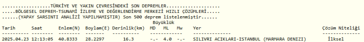 Kandilli Rasathanesi, saat 12:13'te Marmara Denizi Silivri açıklarında 4 büyüklüğünde bir deprem meydana geldiğini duyurdu.