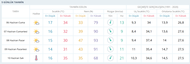 CUMARTESİ az bulutluve 32 derece PAZAR az bulutlu 30 derece PAZARTESİ az bulutlu 31 derece SALI aşırı sıcak ve 35 derece olması bekleniyor.