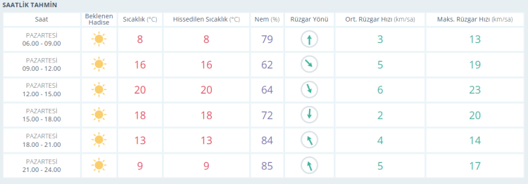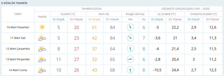 SALI güneşli 23 derece ÇARŞAMBA güneşli 27 derece PERŞEMBE güneşli 27 derece CUMA güneşli ve 26 derece olması bekleniyor.