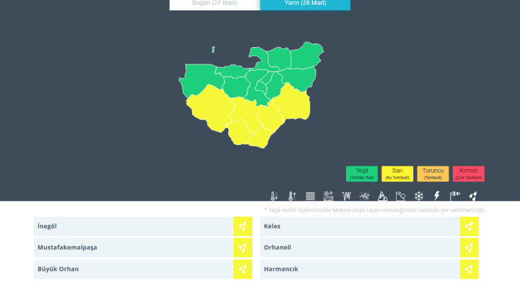 Meteoroloji’den Bursa için flaş uyarı geldi. Kentte yarın (28 Mart 2026) 6 ilçede yerel olarak kuvvetli sağanak yağış bekleniyor.