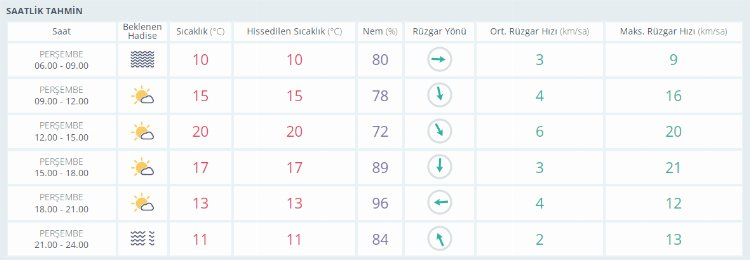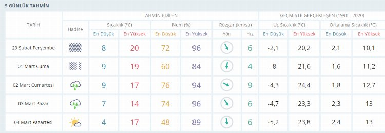 Haftanın son iş gününde (YARIN) sabah saatlerinde termometreler 9 derece olarak ölçülürken gün içerisinde puslu ve bulutlu gökyüzüyle birlikte en yüksek sıcaklık 19 derece seviyelerinde ölçülecek.