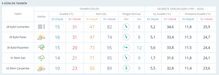 PAZAR parçalı bulutlu ve güneşli 31 derece PAZARTESİ kuvvetli gökgürültülü sağanak yağışlı 20 derece SALI Sağanak yağışlı 21 derece ÇARŞAMBA parçalı bulutlu ve güneşli 23 derece olacak.