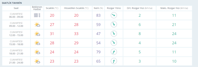 Akşam saatlerine doğru ise termometreler 28 derece olarak ölçülürken az bulutlu gökyüzüyle birlikte gün batımı yaşanıyor. Akşam saatlerinde de az bulutlu gökyüzüyle termometreler 24 derece seviyelerinde ölçülüyor. Gece saatlerinde de az bulutlu gökyüzüyle birlikte termometreler 23 derece seviyelerine kadar geriliyor.