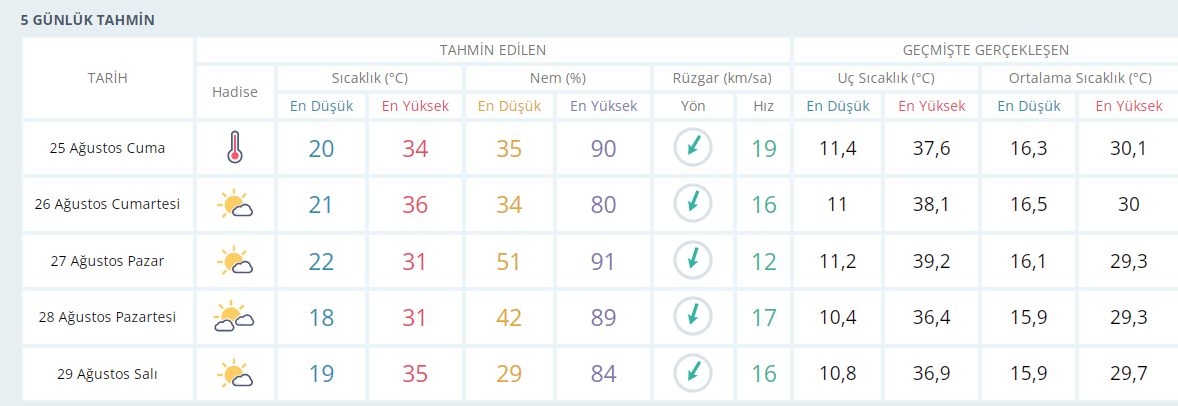 Yeni haftanın ikinci gününde ise (SALI) sabah saatlerinde hava sıcaklığı 19 derece seviyelerinde seyrediyor. Gün içerisinde az bulutlu ve güneşli gökyüzüyle birlikte termometreler yeniden yükselişe geçerek sıcaklık 35 derece seviyelerine kadar tırmanıyor.