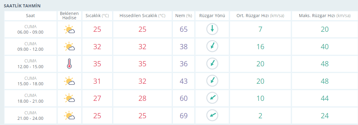 Akşam saatlerine doğru termometreler rüzgarlı havayla birlikte 31 derece olarak ölçülürken az bulutlu gökyüzüyle birlikte gün batımı yaşanıyor. Akşamsaatlerinde de az bulutlu gökyüzüyle birlikte hava sıcaklığı 27 derece seviyelerinde ölçülüyor. Gecesaatlerinde de termometreler 25 derece seviyelerinde.