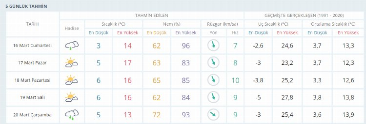 Haftanın üçüncü iş gününde (ÇARŞAMBA) sabah saatlerinde termometreler 5 derece olarak ölçülürken gün içerisinde yer yer yağışlı ve çok bulutlu gökyüzüyle birlikte en yüksek sıcaklık 13 derece seviyelerinde ölçülecek.