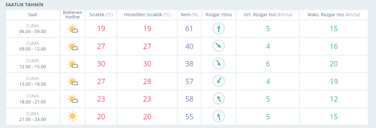 Akşam saatlerine doğru ise termometreler 27 derece olarak ölçülürken az bulutlu gökyüzüyle birlikte gün batımı yaşanıyor. Akşamsaatlerinde de az bulutlu gökyüzüyle birlikte termometreler 23 derece seviyelerinde ölçülüyor. Gece saatlerinde de az bulutlu gökyüzüyle birlikte termometreler 20 derece seviyelerine kadar geriliyor.