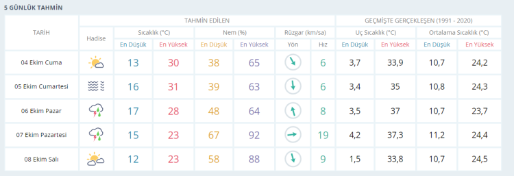 CUMARTESİ puslu, az bulutlu ve güneşli30 derece PAZAR sağanak yağışlı 28 derece PAZARTESİ sağanak yağışlı 23 derece SALI az bulutlu ve güneşli 23 derece olacak.