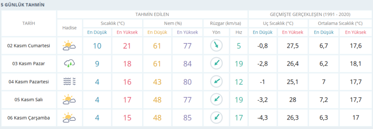 PAZAR hafif sağanak yağışlı 18 derece PAZARTESİ puslu, parçalı bulutlu ve güneşli 16 derece SALI parçalı bulutlu ve güneşli 17 derece ÇARŞAMBA parçalı bulutlu ve güneşli15 derece olacak.