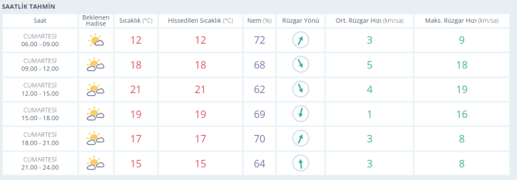 Akşam saatlerine doğru ise termometreler 19 derece olarak ölçülürken parçalı bulutlu gökyüzüyle birlikte gün batımı yaşanıyor. Akşamsaatlerinde de parçalı bulutlu gökyüzüyle birlikte termometreler 17 derece seviyelerinde ölçülüyor. Gece saatlerinde de parçalı bulutlu gökyüzüyle birlikte termometreler 15 derece seviyelerine kadar geriliyor.