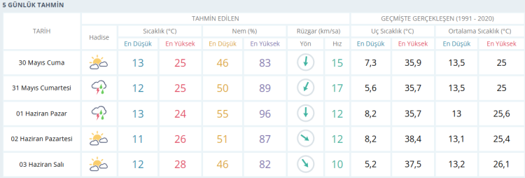 CUMARTESİ gök gürültülü sağanak yağışve 25 derece PAZAR gök gürültülü sağanak yağış 24 derece PAZARTESİ parçalı bulutlu 26 derece SALI parçalı bulutlu ve 28 derece olması bekleniyor.