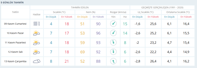 PAZAR parçalı bulutlu ve güneşli 17 derece PAZARTESİ parçalı bulutlu ve güneşli 18 derece SALI parçalı bulutlu ve güneşli 18 derece ÇARŞAMBA çok bulutlu 21 derece olacak.