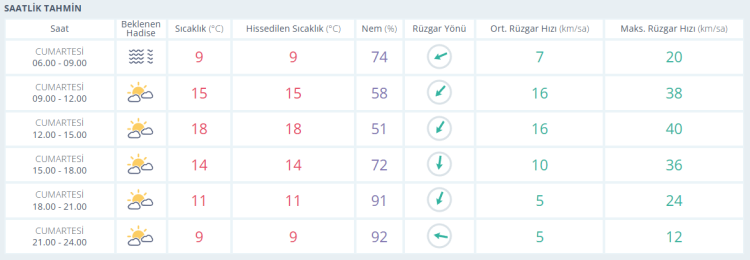 Akşam saatlerine doğru ise termometreler 14 derece olarak ölçülürken parçalı gökyüzüyle birlikte gün batımı yaşanıyor. Akşamsaatlerinde de parçalı gökyüzüyle birlikte termometreler 11 derece seviyelerinde ölçülüyor. Gece saatlerinde de parçalı gökyüzüyle birlikte termometreler 9 derece seviyelerine kadar geriliyor.