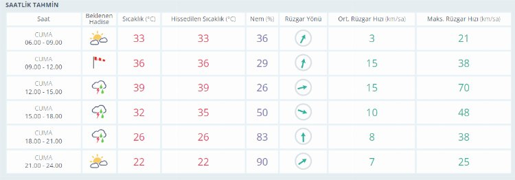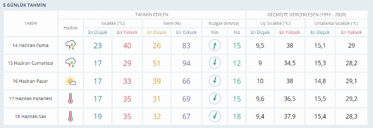 CUMARTESİ gökgürültülü sağanak yağışlı 29 derece PAZAR az bulutlu ve güneşli 33 derece PAZARTESİ bunalıcı sıcak 35 derece SALI bunalıcı sıcak 35 derece olacak.