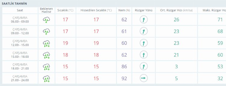 Öğle saatlerinde de şehir genelinde lodos, sağanak yağış ve çok bulutlu gökyüzüyle birlikte hava sıcaklığı 17 derece seviyelerinde ölçülüyor.
