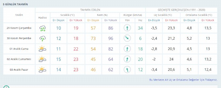 Haftanın dördüncü iş gününde (YARIN) sabah saatlerinde buz kesen termometreler 12 derece olarak ölçülürken gün içerisinde çok bulutlu gökyüzü ve sağanak yağış geçişleriyle birlikte 18 derece seviyelerinde ölçülecek.