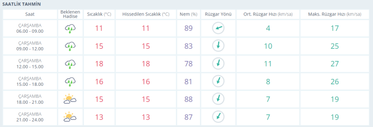 Akşam saatlerine doğru ise termometreler 16 derece olarak ölçülürken çok bulutlu ve bölgesel sağanak yağış geçişiyle birlikte gün batımı yaşanıyor. Akşamsaatlerinde de parçalı bulutlu gökyüzüyle birlikte termometreler 15 derece seviyelerinde ölçülüyor. Gece saatlerinde de parçalı bulutlu gökyüzüyle birlikte termometreler 13 derece seviyelerine kadar geriliyor.
