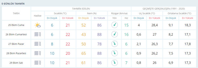 CUMARTESİ puslu, parçalı bulutlu ve güneşli 22 derece PAZAR puslu, az bulutlu ve güneşli 22 derece PAZARTESİ az bulutlu ve güneşli 20 derece SALI parçalı bulutlu ve güneşli21 derece olacak.