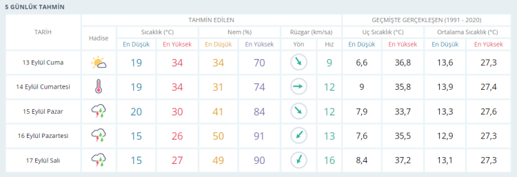 CUMARTESİ yüksek sıcaklık 34 derece PAZAR bölgesel gökgürültülü sağanak yağışlı 30 derece PAZARTESİ bölgesel gökgürültülü sağanak yağışlı 26 derece SALI bölgesel gökgürültülü sağanak yağışlı 27 derece olacak.