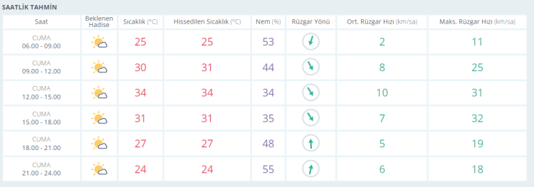 Akşam saatlerine doğru ise termometreler 31 derece olarak ölçülürken az bulutlu ve güneşli gökyüzüyle birlikte gün batımı yaşanıyor. Akşam saatlerinde az bulutlu ve güneşli gökyüzüyle termometreler 27 derece seviyelerinde ölçülüyor. Gece saatlerinde de az bulutlu gökyüzüyle birlikte termometreler 24 derece seviyelerine kadar geriliyor.