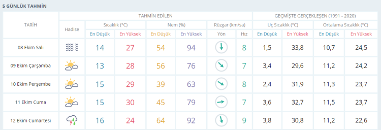 ÇARŞAMBA parçalı bulutlu ve güneşli28 derece PERŞEMBE parçalı bulutlu ve güneşli 29 derece CUMA parçalı bulutlu ve güneşli 30 derece CUMARTESİ sağanak yağışlı 24 derece olacak.