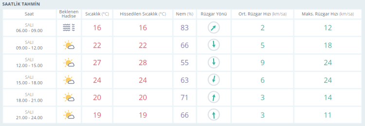 Akşam saatlerine doğru ise termometreler 24 derece olarak ölçülürken az bulutlu gökyüzüyle birlikte gün batımı yaşanıyor. Akşam saatlerinde de az bulutlu gökyüzüyle birlikte termometreler 20 derece seviyelerinde ölçülüyor. Gece saatlerinde de az bulutlu gökyüzüyle birlikte termometreler 19 derece seviyelerine kadar geriliyor.
