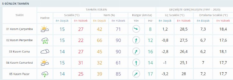 Hafta sonunun son gününde ise (PAZAR) sabah saatlerinde 14 derece olarak ölçülürken gün içerisinde sağanak yağış geçişleri ve çok bulutlu gökyüzüyle birlikte termometreler 25 derecelere kadar gerileyecek.