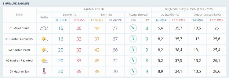 CUMARTESİ az bulutlu ve güneşli 32 derece PAZAR az bulutlu ve güneşli 32 derece PAZARTESİ parçalı bulutlu ve güneşli 33 derece SALI güneşli 35 derece olacak.