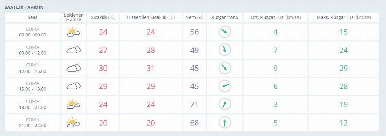 Öğle saatleri sonrası ise çok bulutlu gökyüzüyle birlikte hava sıcaklığı 30 derece seviyelerinde.