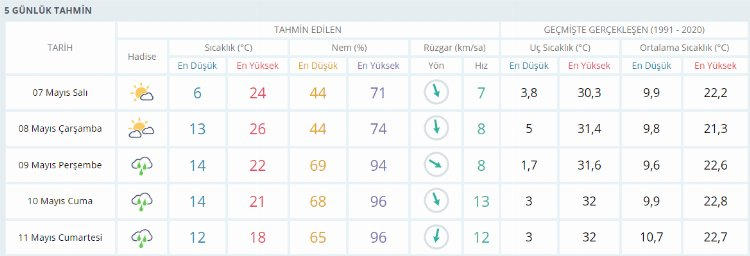 ÇARŞAMBA parçalı bulutlu 26 derece, PERŞEMBE sağanak yağışlı 22 derece, CUMA sağanak yağışlı 21 derece, CUMARTESİ ise sağanak yağışlı 18 derece olacak.